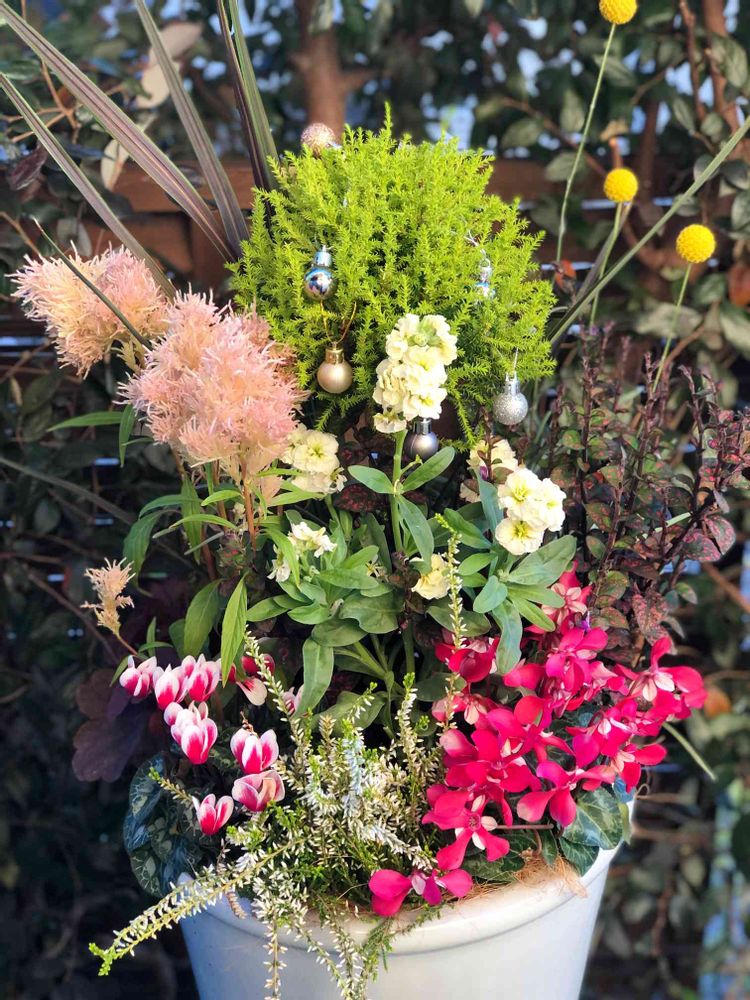 大きい鉢の寄植え、昨日と同じデザインの大鉢です。