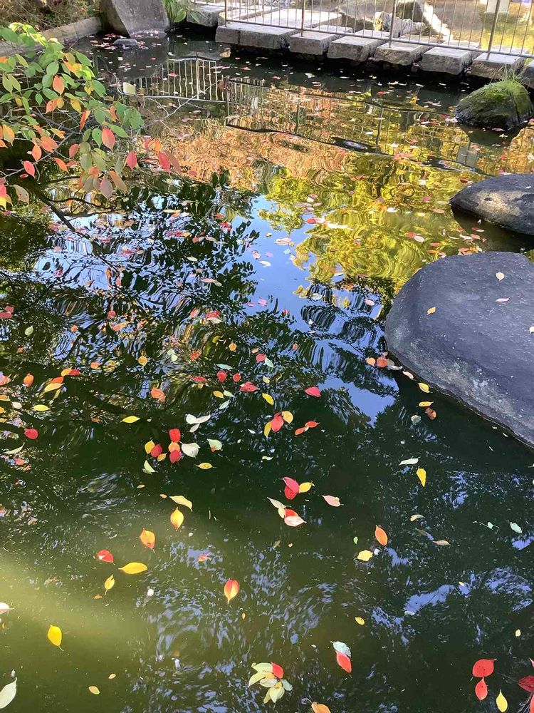 池面に映る紅葉した木々と色づく葉🍁