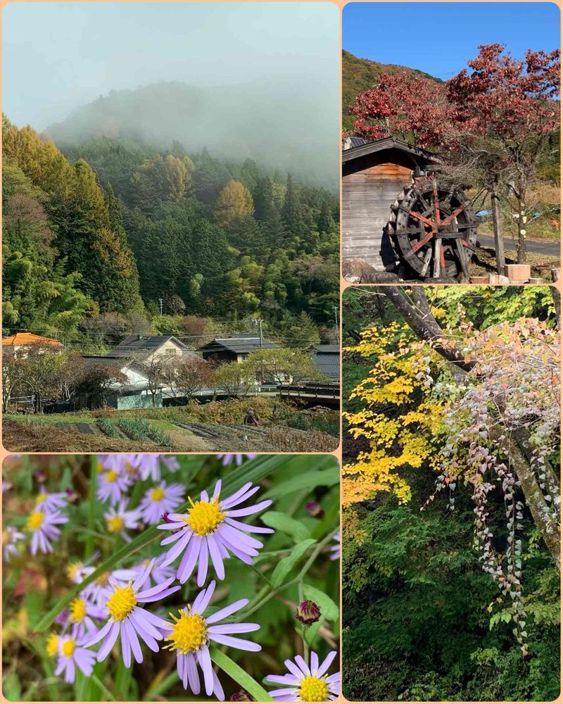 靄がかかりぼんやりの山里と紅葉の木や蔦が綺麗でした。道端にはノコンギク。