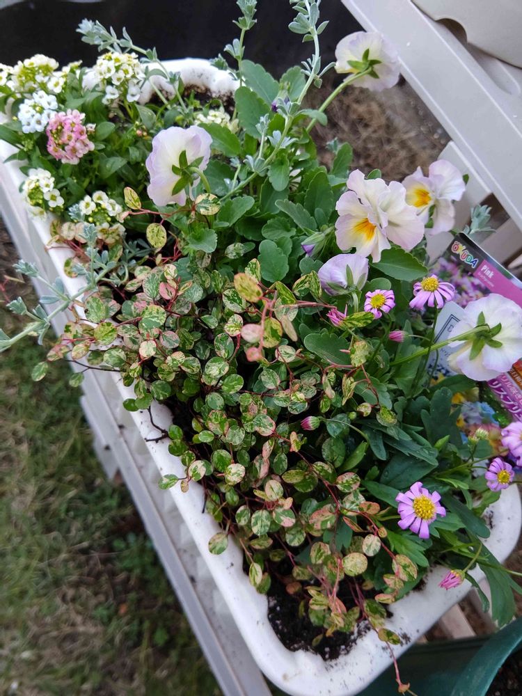 かわいいパステルピンクのイリスプリエールをメインに、ブラキカムやアリッサムなんかと一緒に寄せ植えしました🥰