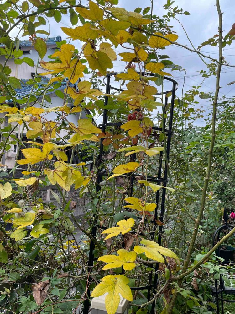 夏の間あまりの日差しの強さにピエーさんの木陰に移しておいたら鉢から根をおろし、あっという間にオベリスクを占領してしまいました😅