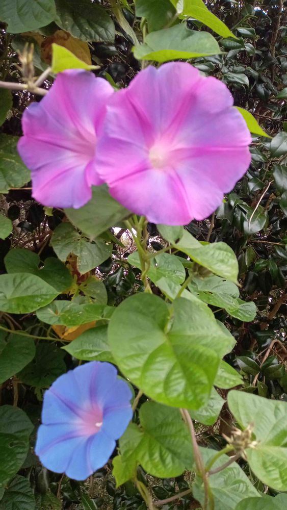 ひとつの枝に2つの色こんな朝顔見たことない と思い調べてみたら琉球朝顔とのこと二度咲きするのですね~🤗