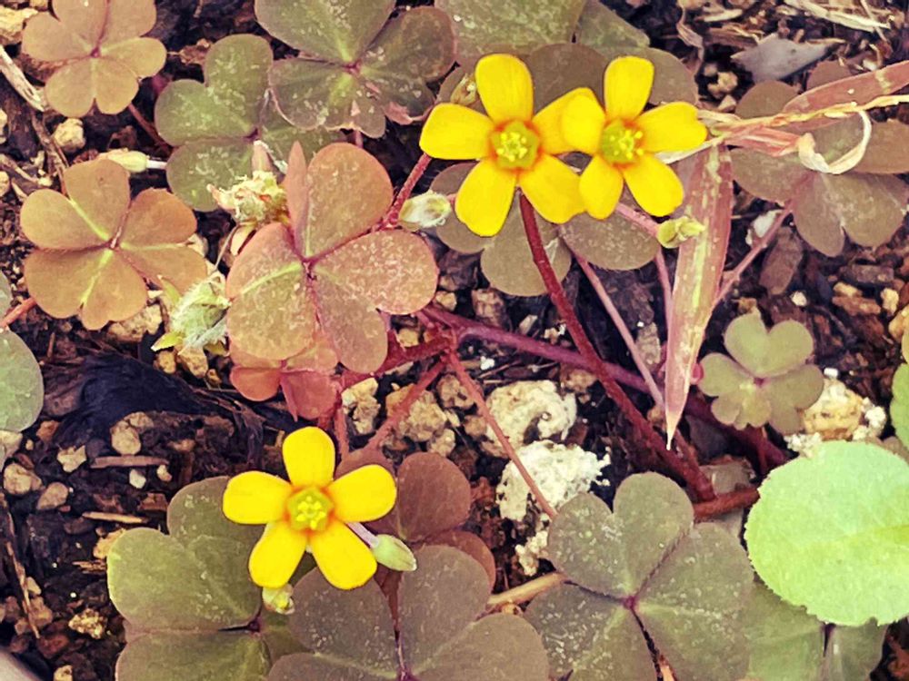 2022ー 11ー4(金)🟦☀️🟦晴れ 未だ未だ💪😤頑張る オクラのプランターの中 カタバミ🌼の花? とっても健気に葉っぱの色も変わり咲いています。