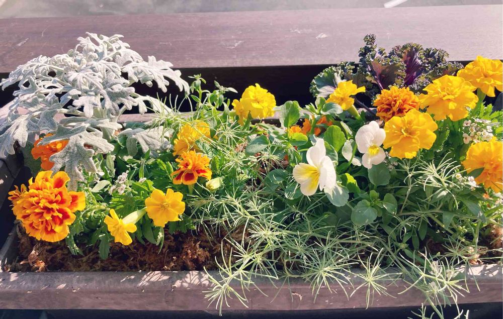 窓辺にイエロー系の寄せ植えで元気モリモリ💛🌼🧡