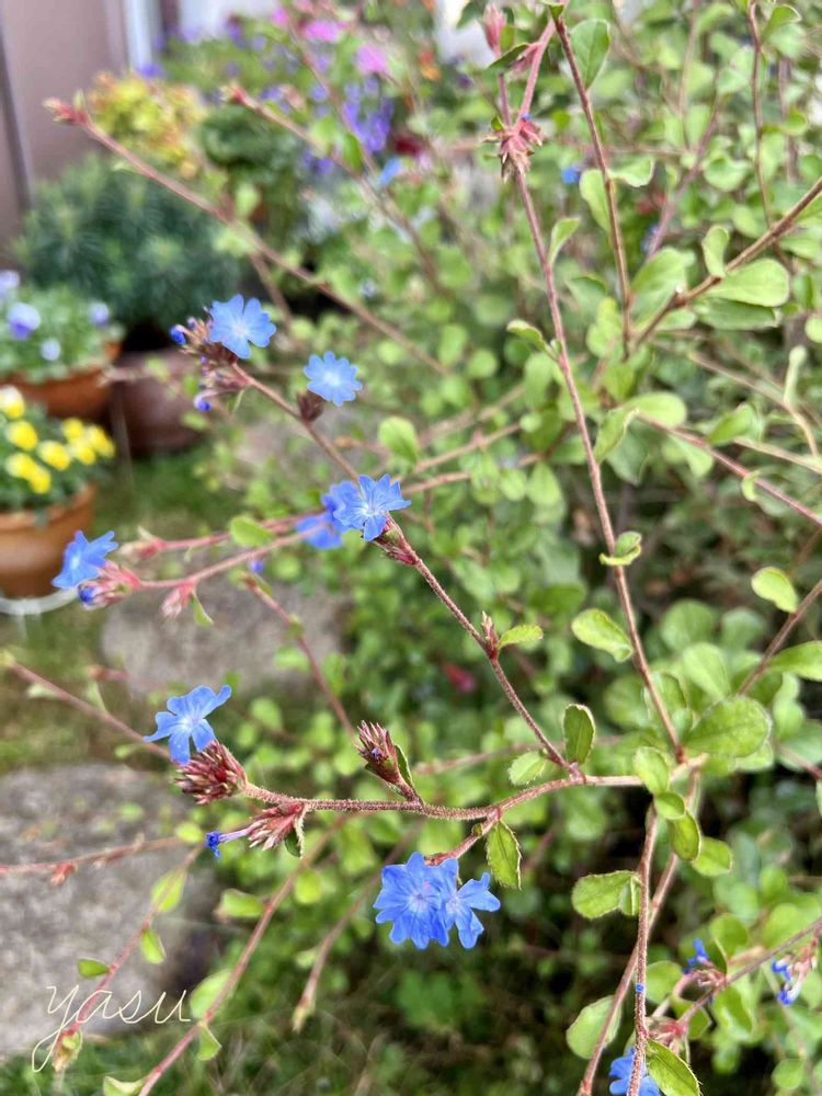 玄関から庭への通路に植えて3年目のブータンルリマツリ💙