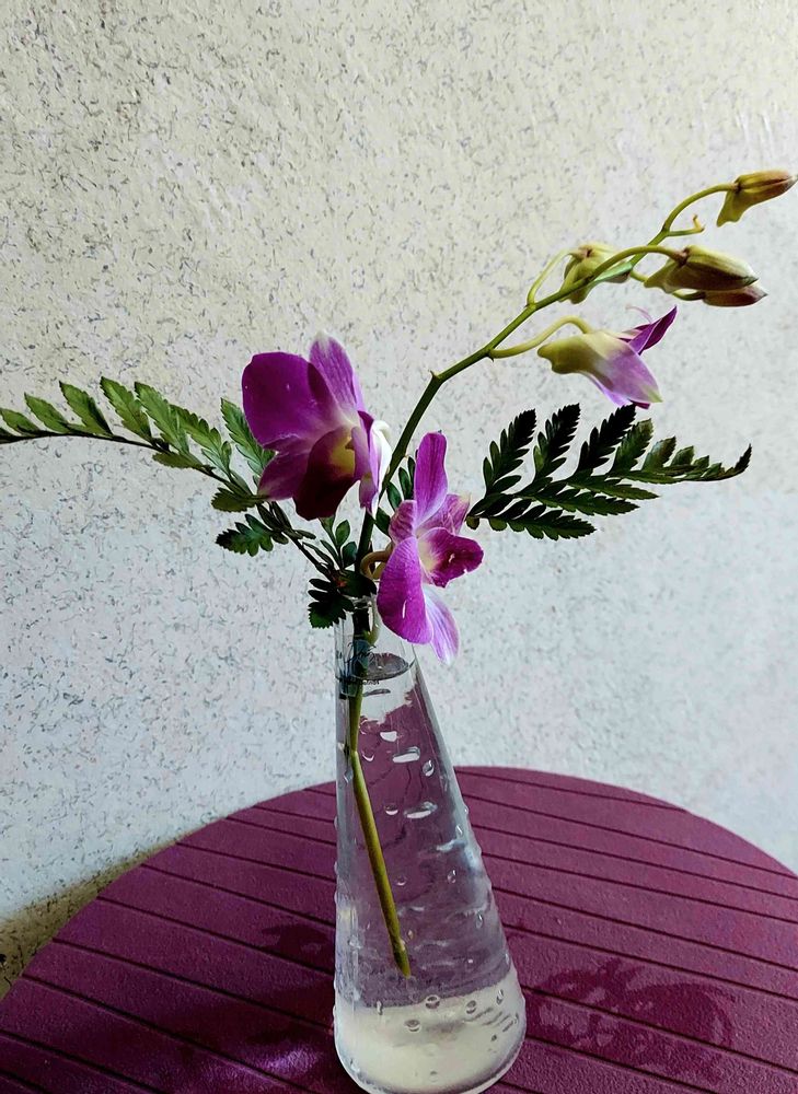 先日投稿した退院㊗️で貰ったフラワーアレンジの花籠💐の水揚げが悪くて💦なかなか開花しないデンファレのお花💜をガラス瓶に生けてみました😍💓🎶