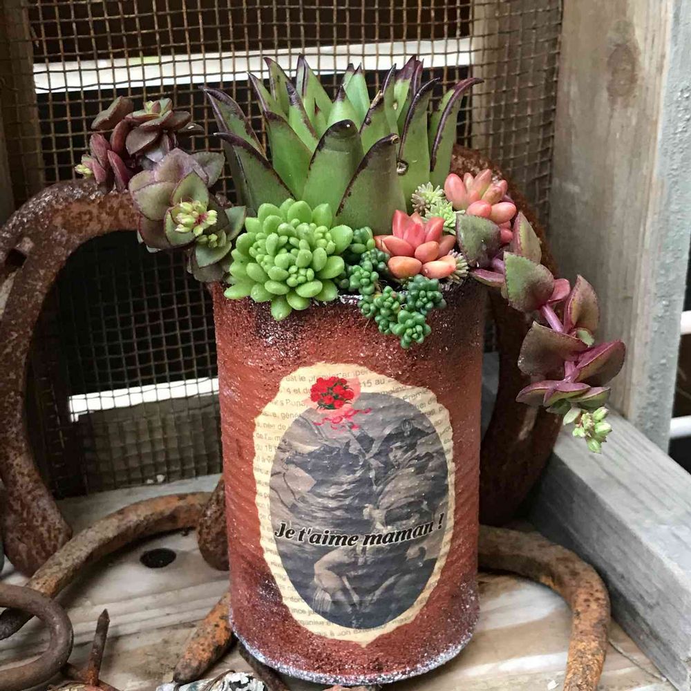 母の日パロディ缶に寄せ植え(*⁰▿⁰*)