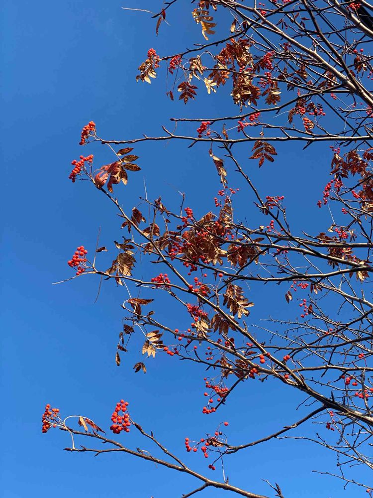 青空には真っ赤なナナカマドの実と紅葉🍁した葉っぱが映えて、美しいですね〜✨🤗