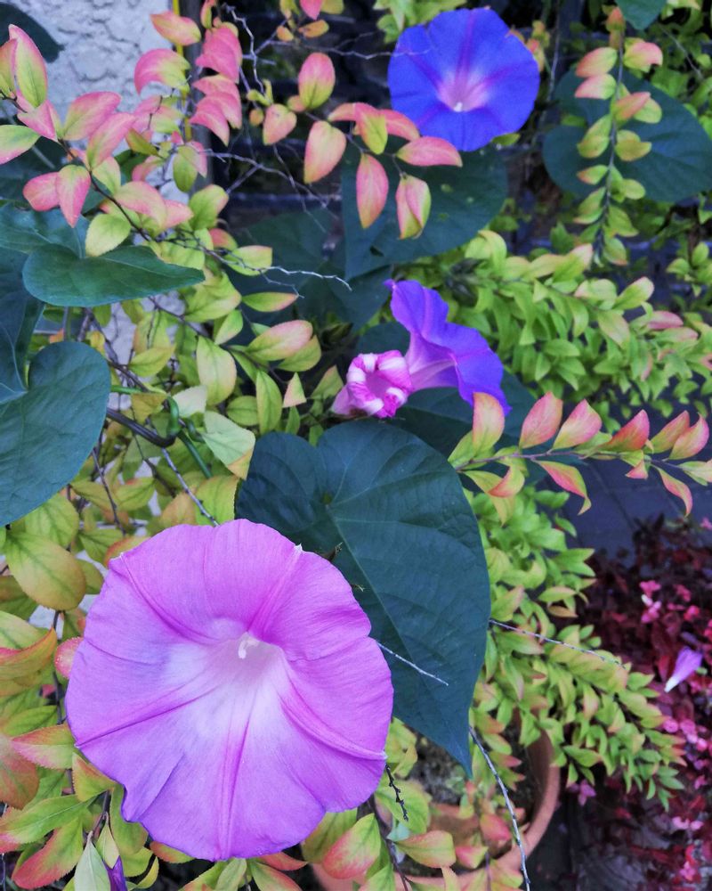 ご近所の庭先に無造作に置かれていた鉢植えと一緒にアサガオの花を撮ったら、まるで生花のように決まってた。