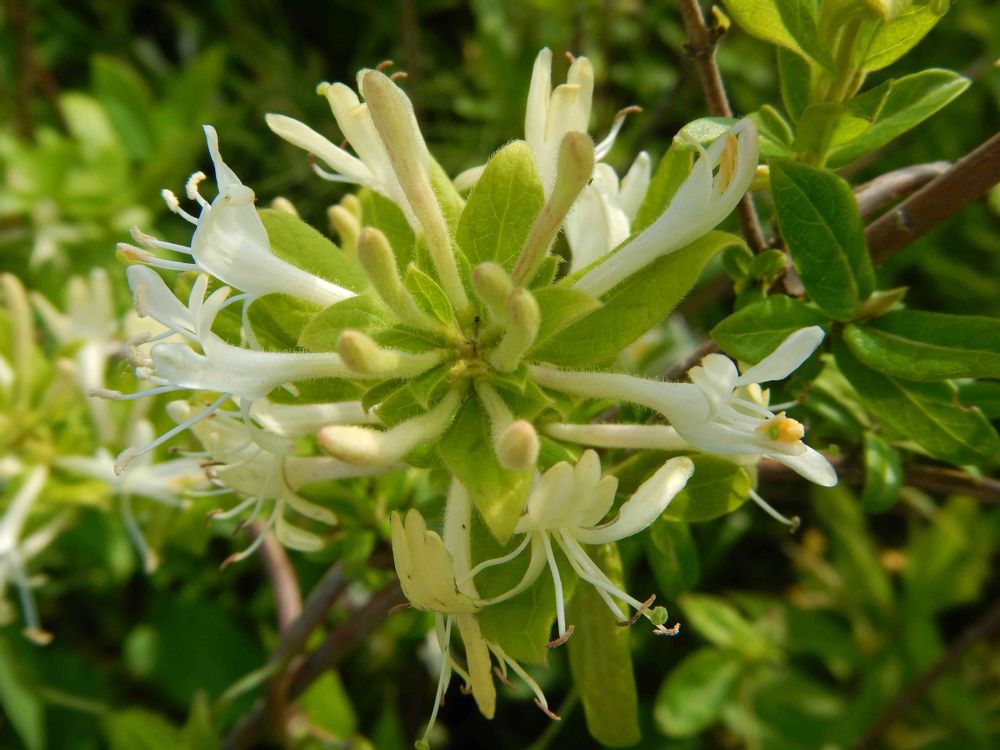 さん、個人的には小さな花が一つづつばらばらに咲くのがスイカズラ、沢山集まって丸く咲くのはハニーサックルと呼ぶのが一般的かなと思います。