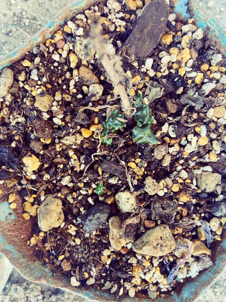 夏に枯らしたと勘違いしてた。玉盃。冬型だったようです。枯れてから日陰に放置。鉢を再利用とみたら、ワカメ?よーく見ると新芽が👀✨。調べると冬型でした。危ない危ない。