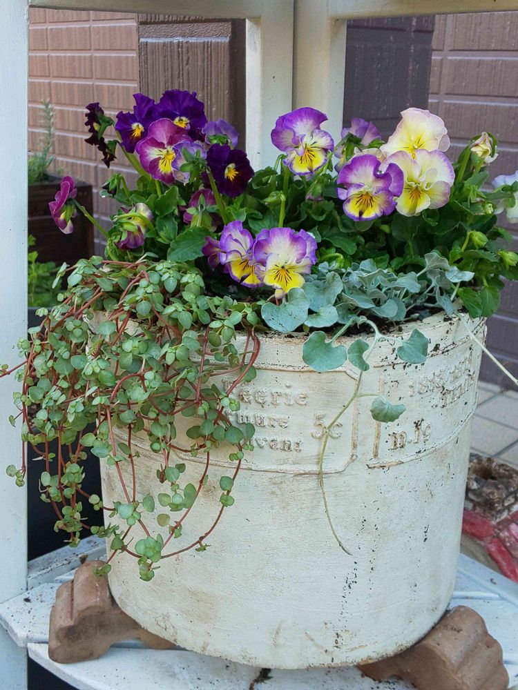 フリル咲きのビオラの寄せ植えを作りました。