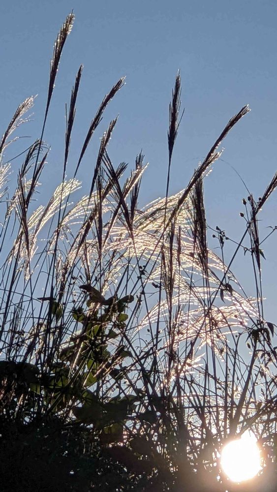 道すがら見かけた❗道路脇の土手で青空と夕日に映えてイキイキと咲き誇る綺麗な🌇ススキと夕日🌇🌿🍀🌱