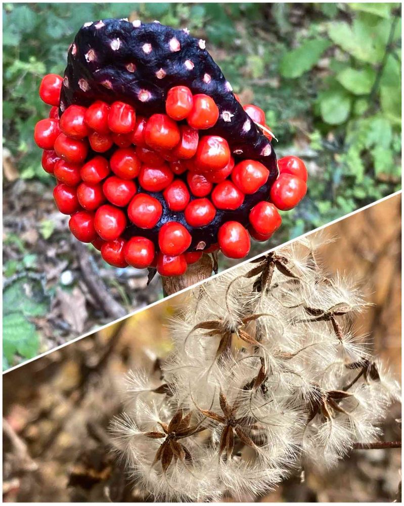 紅葉を撮ったあとで出会った、マムシグサさんの実と、センニンソウさんの綿毛です❤️🤍