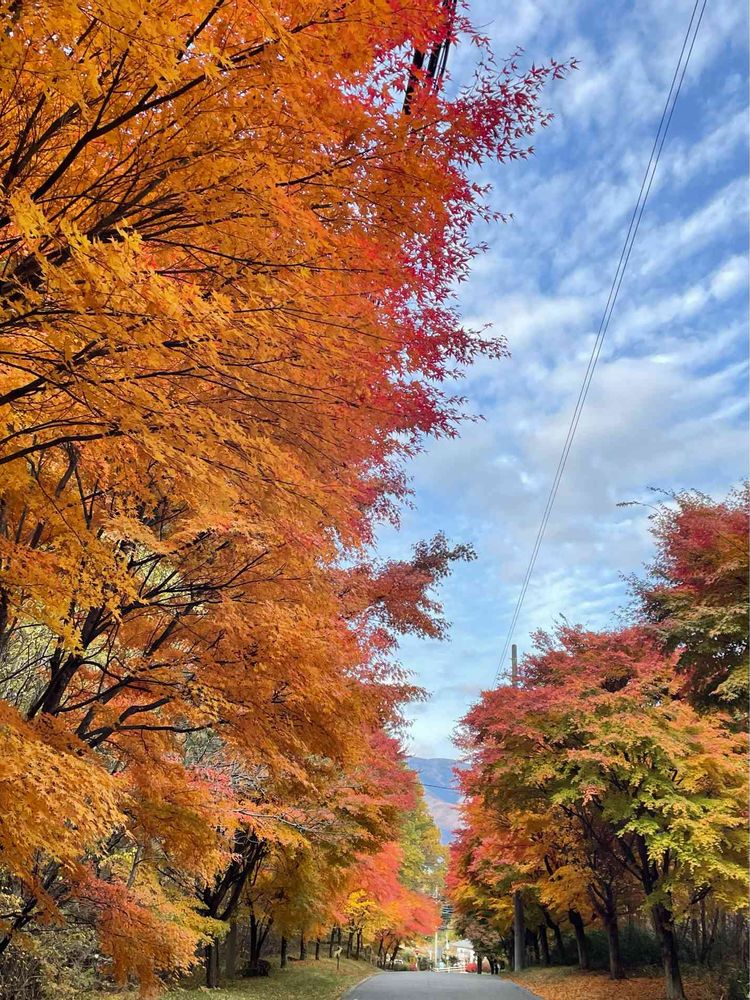 八ヶ岳南麓、標高1000mの通称「もみじロード」。紅葉前線が駆け足で通過中の今朝は2、3度の冷え込み。見事な錦繍に、すじ雲(巻雲)が緩やかに溶けた空の向こうは、南アルプス連峰が見える。