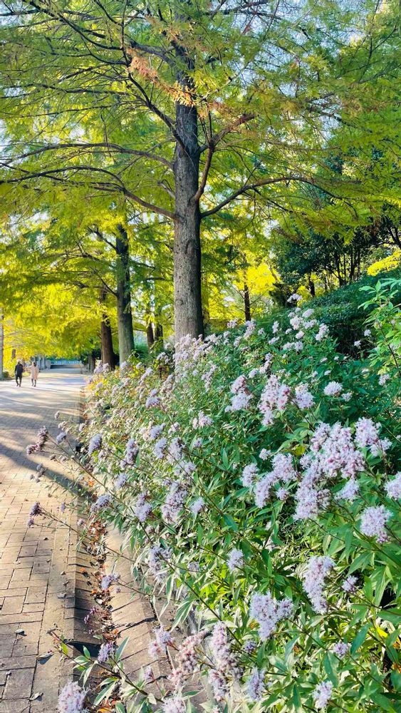 夕暮れ時のフジバカマとラクウショウの並木道☺️優しい日差しが降り注ぐ穏やかなひととき🧡