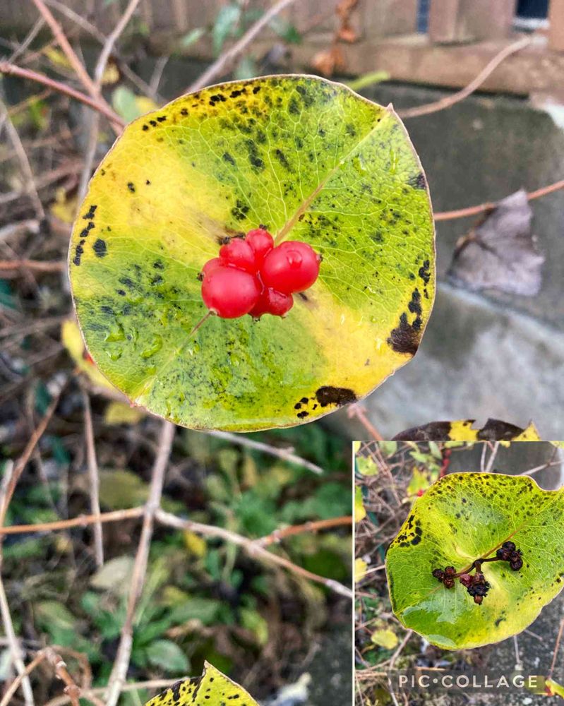赤い実と黒い実、どちらも丸い葉の真ん中にチョコっと❣️ 可愛いくて思わずパチリでした😃