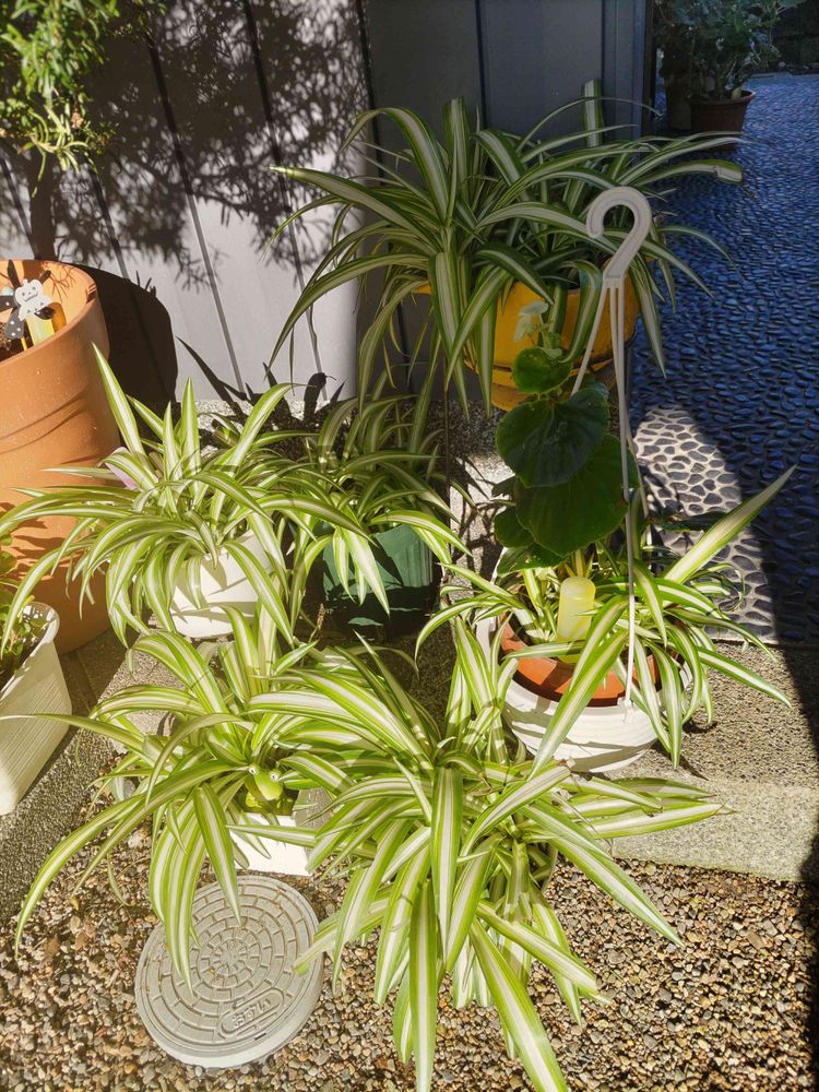 オリヅルランの子株が成長したので同時期に鉢に植えました。今はおひさまが出てるので子株を移動しました。