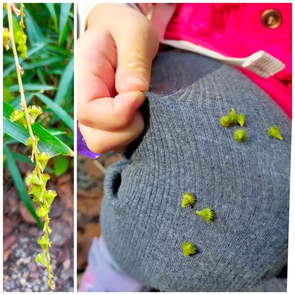 ヌスビトハギだけでなく、キンミズヒキも引っ付き虫だよと伝えるも、服には付くが手には付かないことに不服な娘。