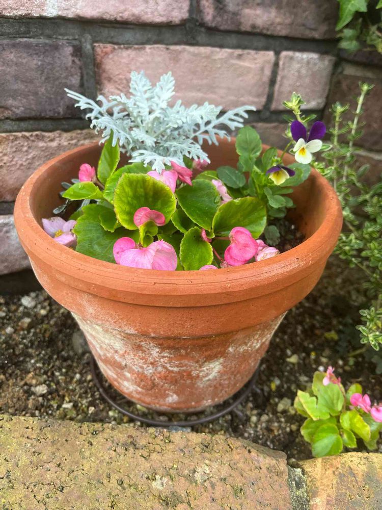家で挿し芽したベゴニア、タネから育ったパンジー、挿し木したシロタエギク