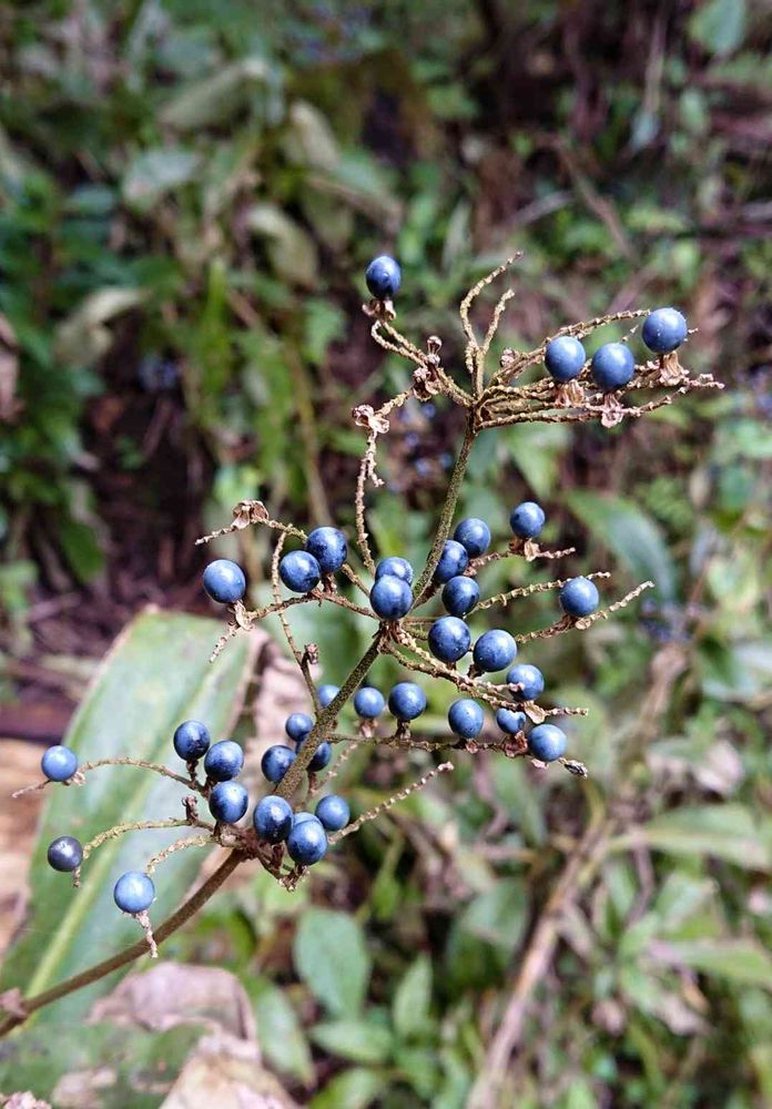 ツユクサ科ヤブミョウガ属の多年草。林内など湿り気の多い日陰に生える。茎や葉はざらつく。花期は8~9月。茎の先に白い花が輪生状に数段つき、両性花と雄花がまじってつく。花は開くとその日のうちにしぼむ一日花。果実は球形の液果。秋に藍紫色に熟す。表面に光沢があり、乾いても裂けないため長い間残る。種子は灰色で砂粒ほどの大きさ。