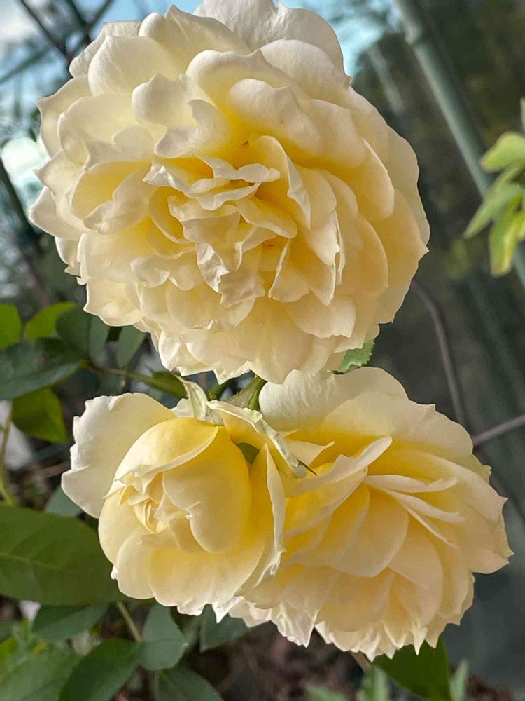 淡いクリーム色のチュチュのような房咲きのバラです。