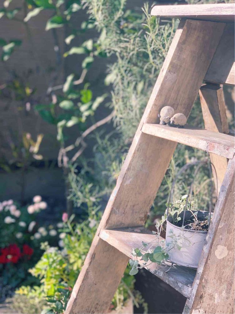 はしごめっちゃ良いです❣️飾れるし登れるしアルミ缶買って早速ハーブ植えて飾りました🌿アンティークなので庭馴染みが良くて見るたびに幸せです💕