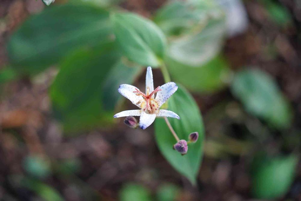 確か青龍という名前のホトトギスの花が今年も咲きました。白地に青い斑入りの花です。