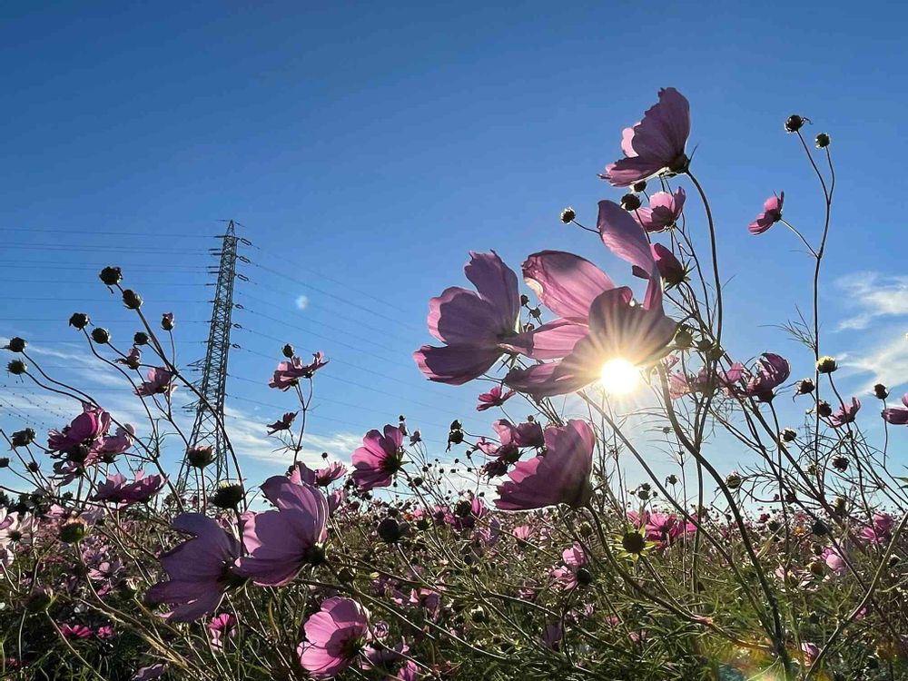 青空とコスモスにタワーが映えています🗼💙🌸🌸