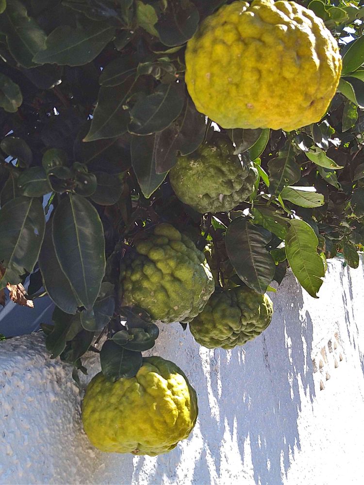 大きい柚子が塀からはみ出して成っています。🔍すると獅子柚子と出ます。