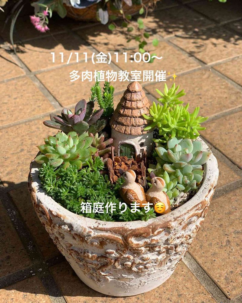 多肉植物の寄せ植え教室生徒様募集中です♪ 今月は多肉とセダムとミニチュアの小物を使って箱庭作ります🌿 初めての方でも安心! 植え方のコツや育て方を丁寧にお教えします!! 細かい作業が苦手な方でも無理なく制作出来る様にお手伝いしますのでお気軽にご参加下さい✨ お問い合わせ、お申し込みは店頭またはお電話、Instagram、グリーンスナップからも受け付けております!