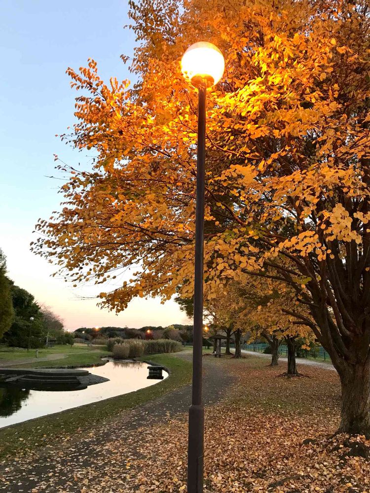 散歩途中陽が沈んで街灯が点灯
