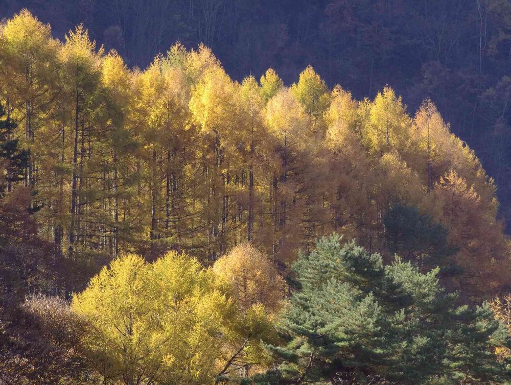 タイミング良く朝陽にあたった落葉松林を見る事ができました。