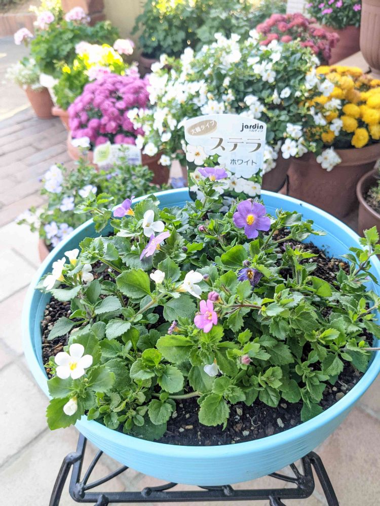 去年は2色、今年はこんなカラフルなプラスチック鉢なので3色🌱🌱🌱