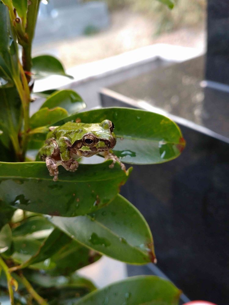 お墓掃除に行ったら、花立てのサカキの陰に、まだアマガエル🐸がいた😅