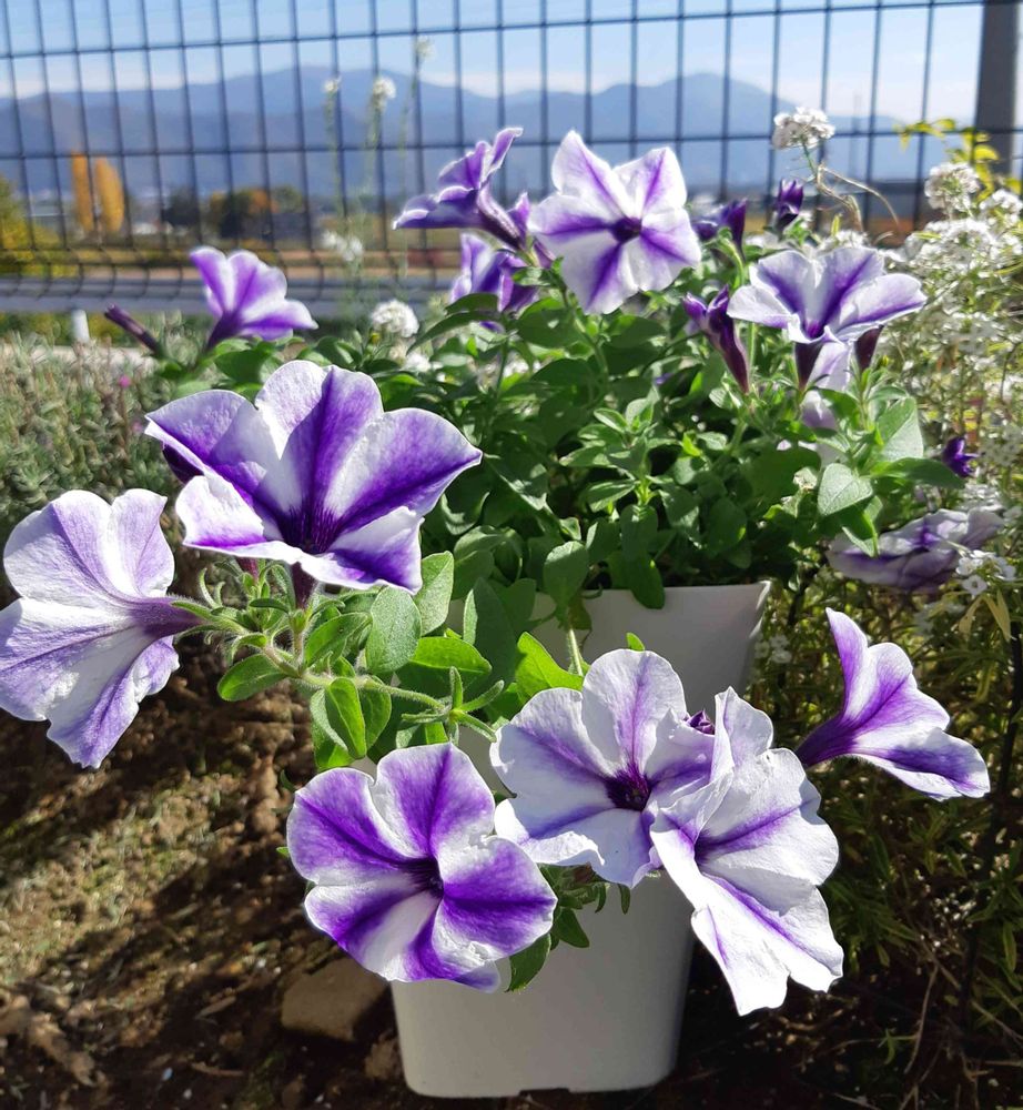 朝晩は暦らしい寒さの中、挿し芽っ子のサフィニアアートるりいろ風ぐるまの紫が濃くなって本来の色あいに💠