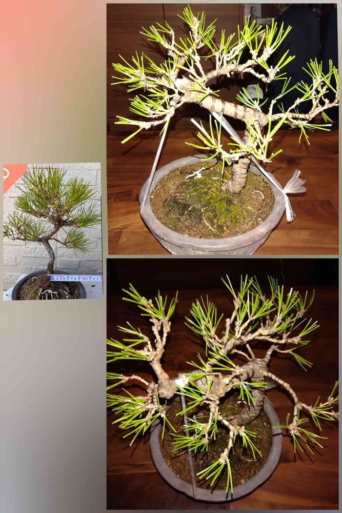 正月用にと思ってフリマで黒松を購入(左)。葉や枝の整理が余り手付かずだったので、葉の整理から始め不要な小枝もバシバシ切った。我ながら思い切ったものだ。針金と紐で樹形を好みに変えてみた(右側)。スッキリしすぎたかなあ~🪴🪴🪴