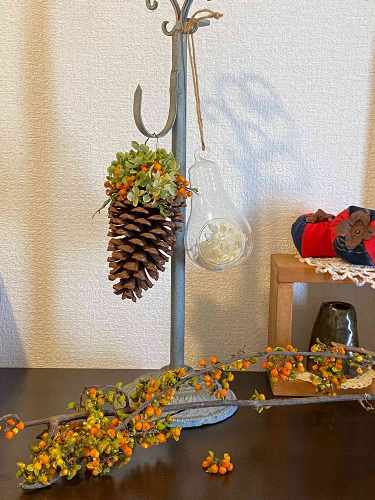 大きな松ぼっくりにアジサイと🟠🟠🌿
