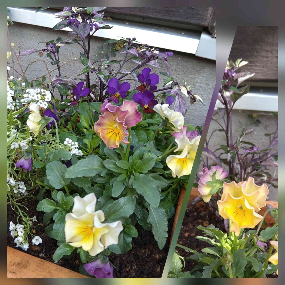 フリル咲きビオラ イリスプリエールが買って来た時から、ピンクと黄色から紫と黄色に色変わりしてきました。白い花も咲いてます。