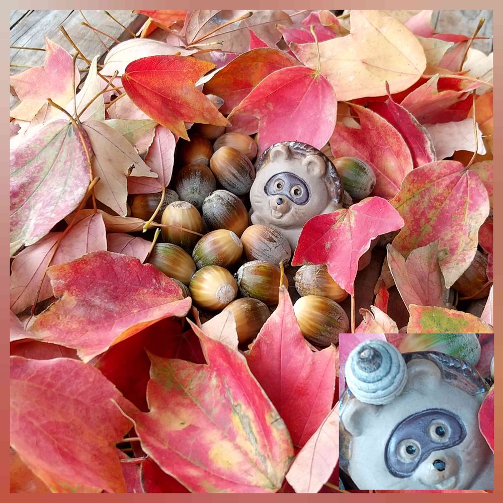 どんぐりを頭に乗せてひょうきん顔の🦝たぬきさん(^^)