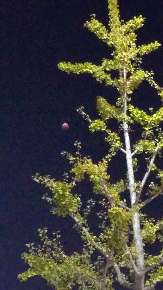 「イチョウ」の向こうに皆既月食が見えます。オレンジ色のピンポン玉が夜空に浮かんでいるようでした。🔴🌲🏙️🌌😊😄🤗🧖♂️