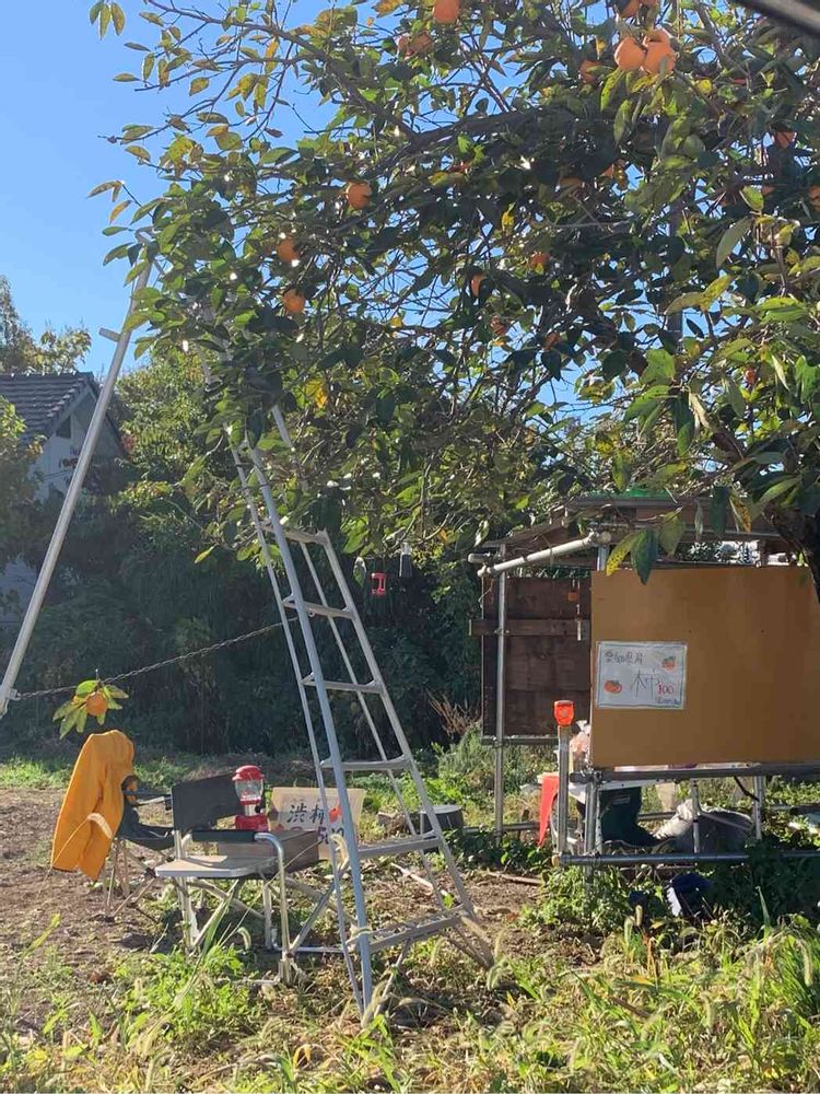 農具用の小屋の中にビニール袋に入った柿の実が見えます。