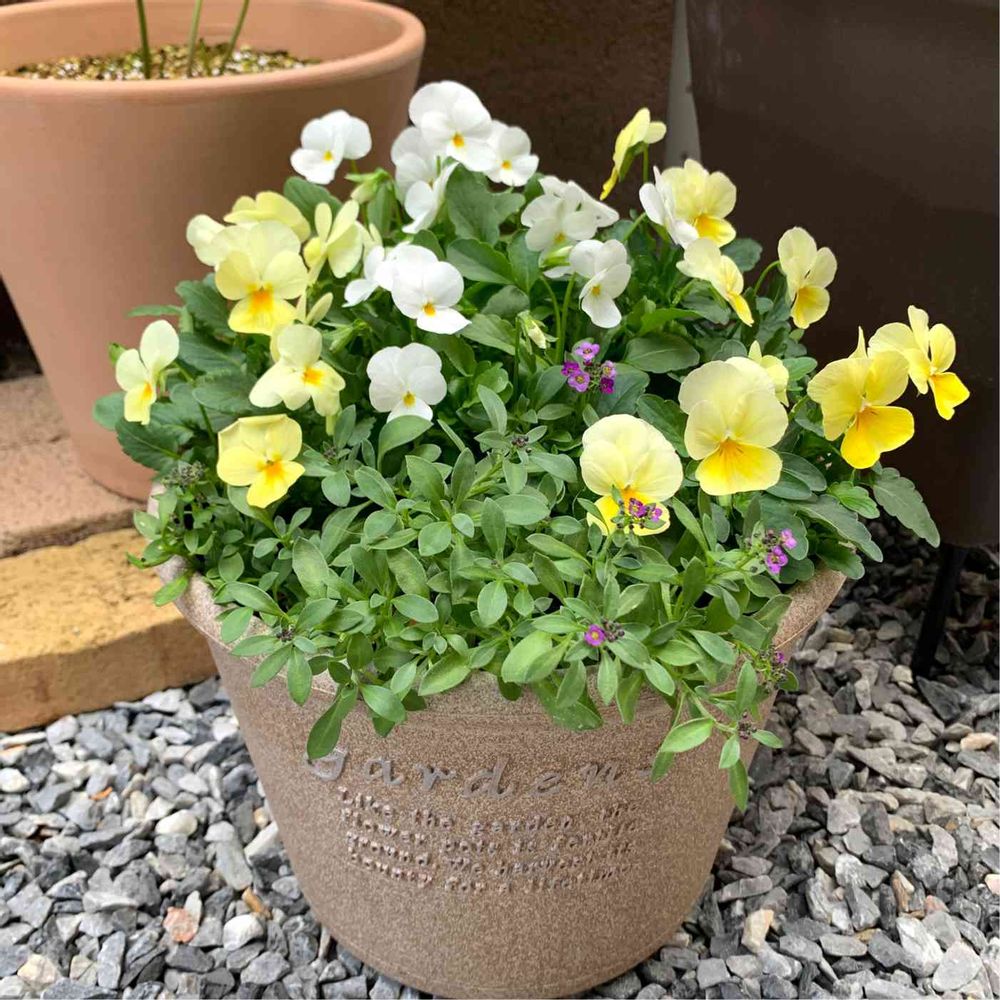 初心者な寄せ植えですが自己満です😊紫のお花も少し咲いてきて見るたびに癒されます♪
