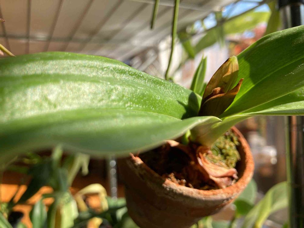 このパフィオは、3、4年前にサヨナラコーナーからお迎えして、1番死にそうで、この株だけ何故か水苔に素焼き鉢で管理していたのだけど…。