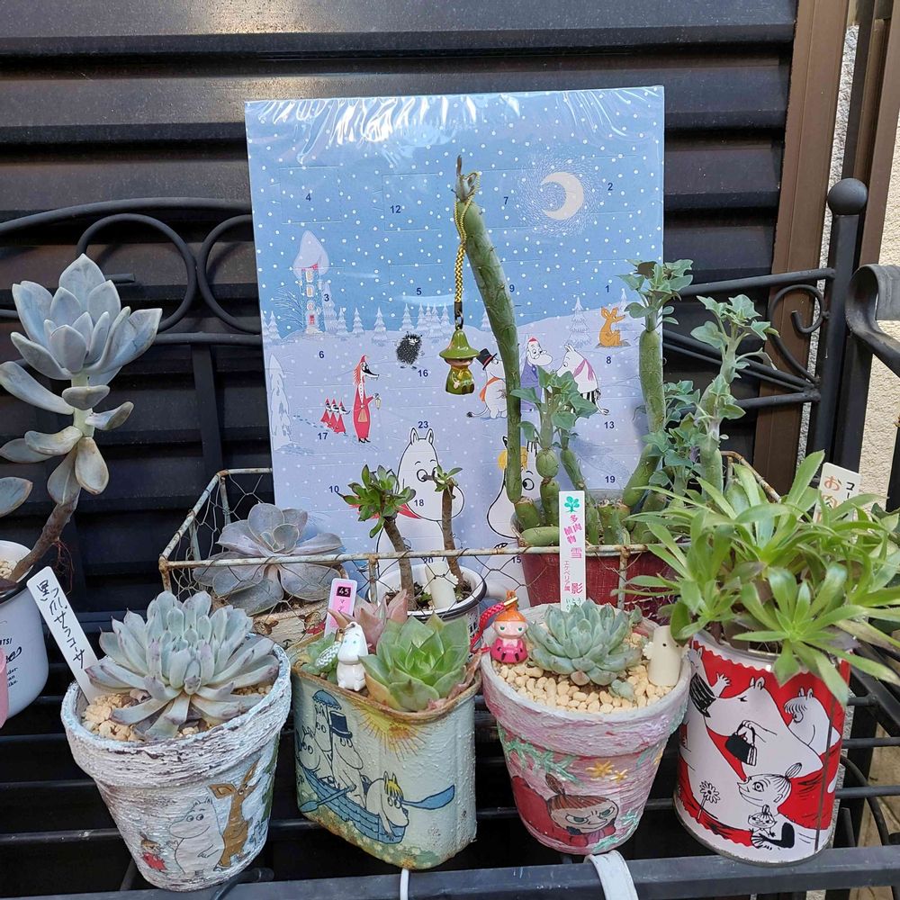 ムーミンの鉢が増えて賑やかになりました😂右端はいちごさんからのムーミンのお菓子の缶にアエオさんを植えました🎶さくら餅子さんからのリメ缶可愛い💕左奥の鉢はミィーがチラ見えでした🙏奥のニョロニョロに似た七宝樹と黒法師に毛が🤭💦葉っぱ🌱が増えてきました😂