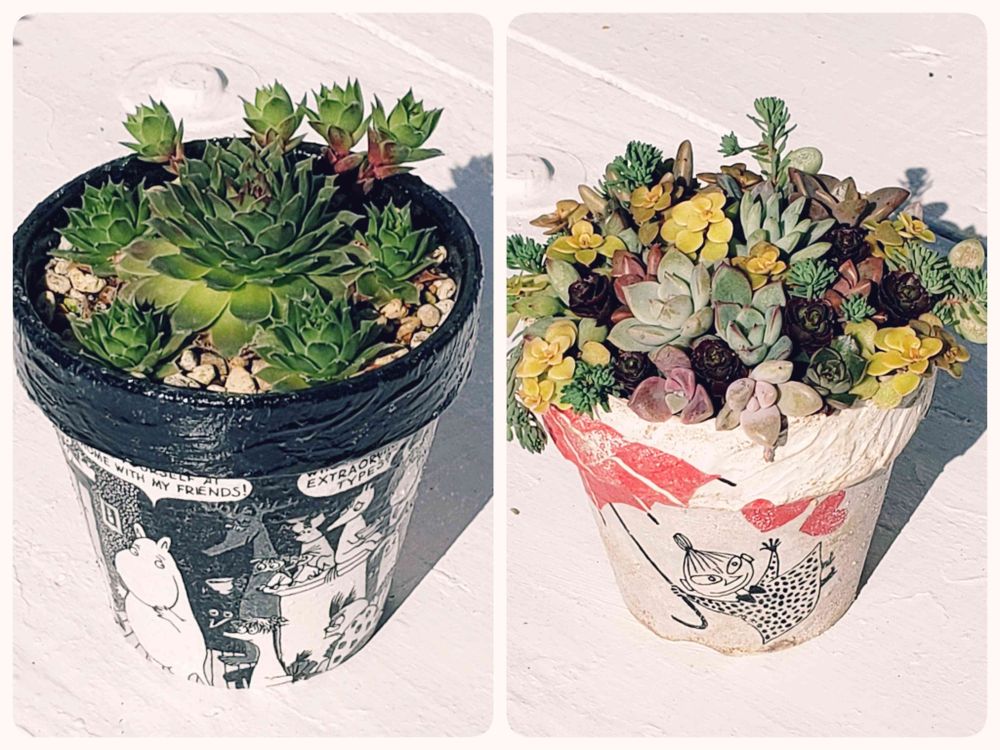 ムーミンの日知らなかったわ。ミーチャンリメイク鉢可愛い。なつ子さんお友達一杯だから羨ましいわ。前に頂いた鉢色がはげてきたらどうしたら良いんですかね。皆さんお上手。来年は群馬に行きたいね。草津温泉最近テレビ良く見るので♨️フラワーパーク良いところに住んでますね❗️だんだん寒くなって来たので風邪引かないでね😷インフルエンザワクチンまだしてない。真っ赤に腫れて痒くなるから