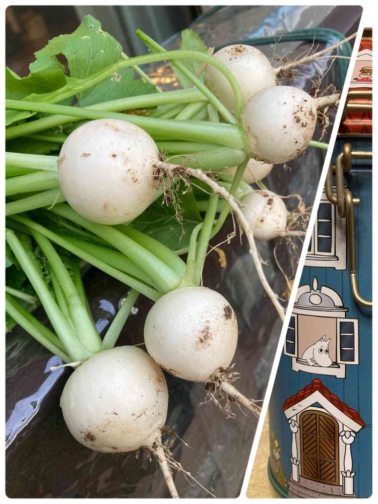 並べてコラージュしたムーミンハウスのサイズで比べると、すごく大きな蕪ですよ〜
