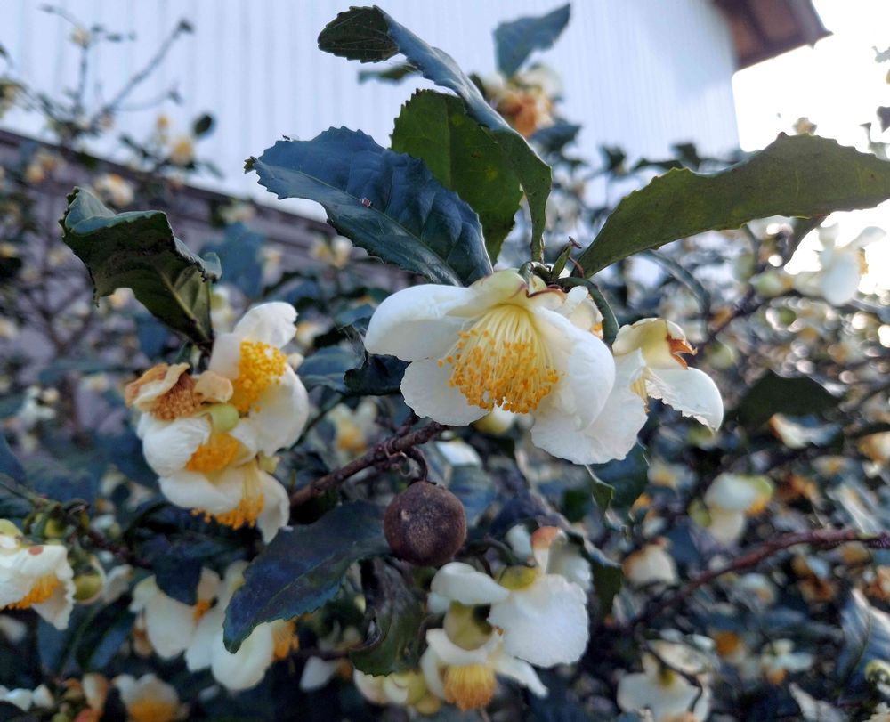 茶の木、うちでは亡き義父が風避けで畑のあちこちに植えてあり、今 お花真っ盛りです。たくさんの虫が集まっています。ミツバチならいいのですが、スズメバチにも貴重な今時の花蜜ですから 用心しています。