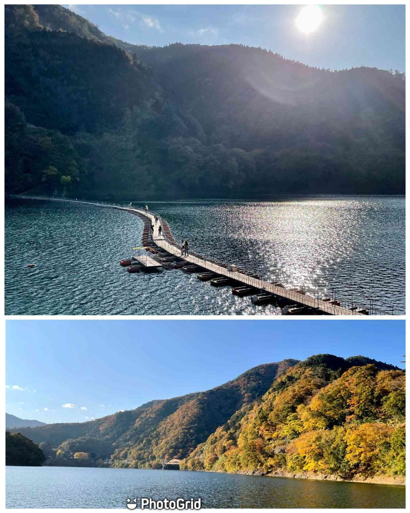 東京奥多摩湖の紅葉と浮橋