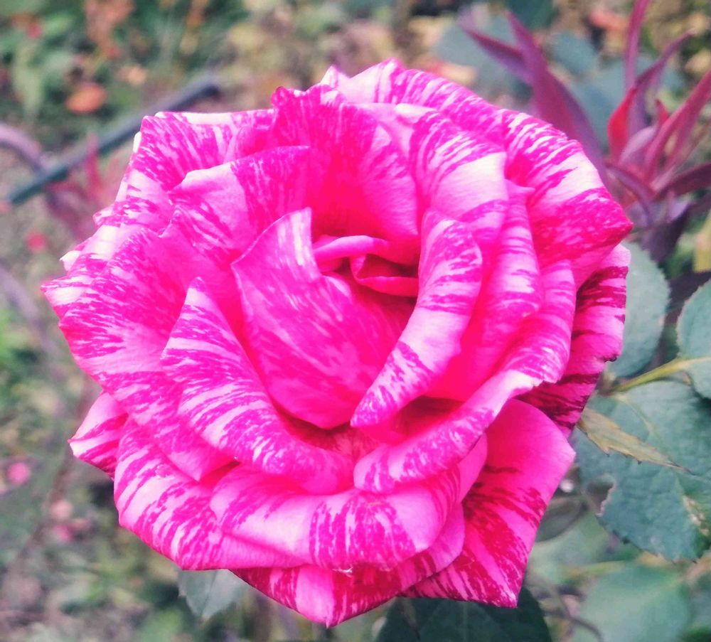 鮮やかなパープルピンクにストライプの絞りの入った、印象的な薔薇・「フランボワーズ・バニーユ」で、おはようございます🌹✨